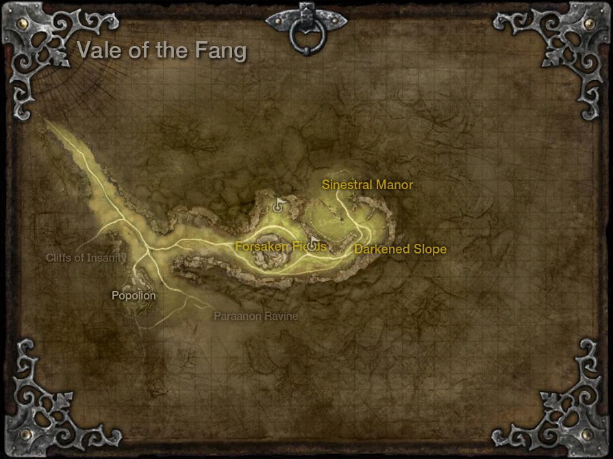 | Cliffs of Insanity • Lake of Tears • Paraanon Ravine • Vale of the Fang • Popolion • Pora Elinu |